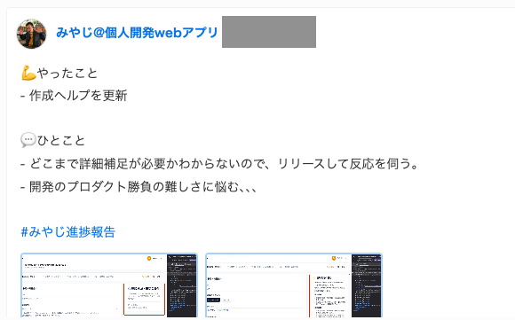 ここでは、自分用のチャンネルを作り、作業する前と後で進捗を投稿していきました。個人チャンネルなので個人開発有名人でもなければわざわざアクセスしてリアクションしてくれるということあまりないです。